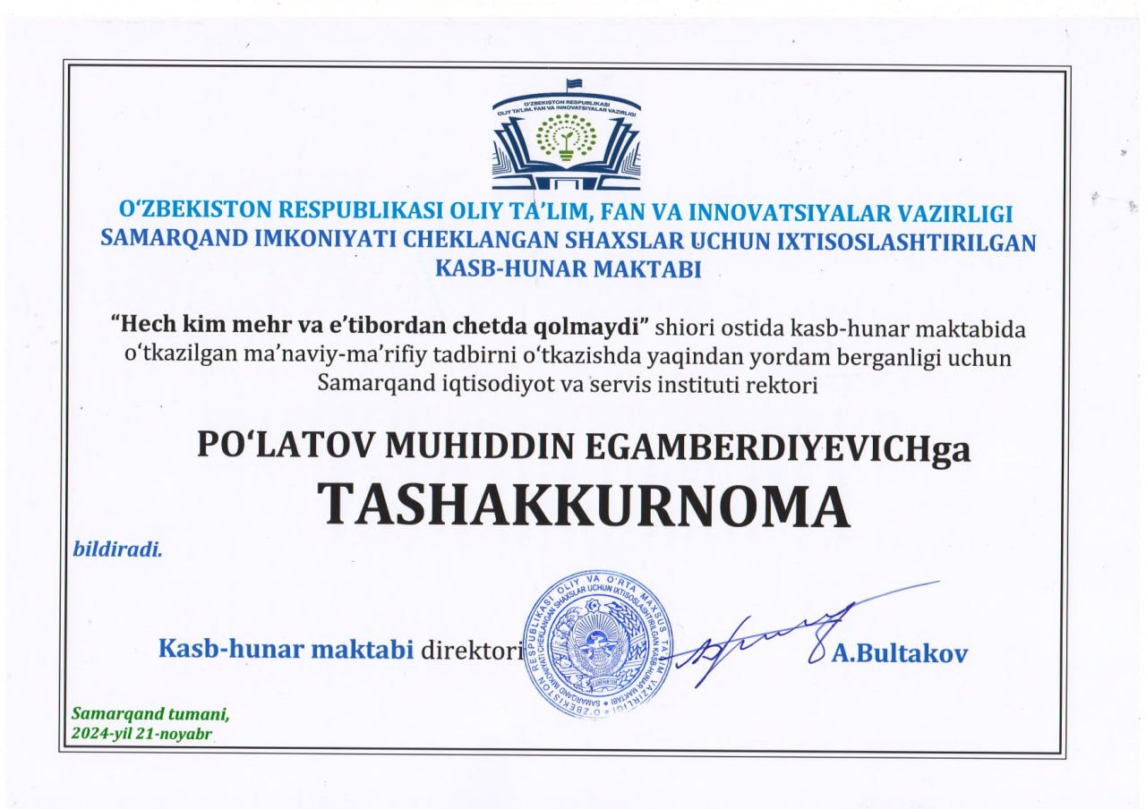 Coordinators and active students of the Youth Union of the Samarkand Institute of Economics and Service visited a specialized vocational school for people with disabilities in Samarkand within the framework of the "Let's Share Kindness" project. During this visit, a spiritual and educational event was held under the slogan "No one is left without kindness and attention."